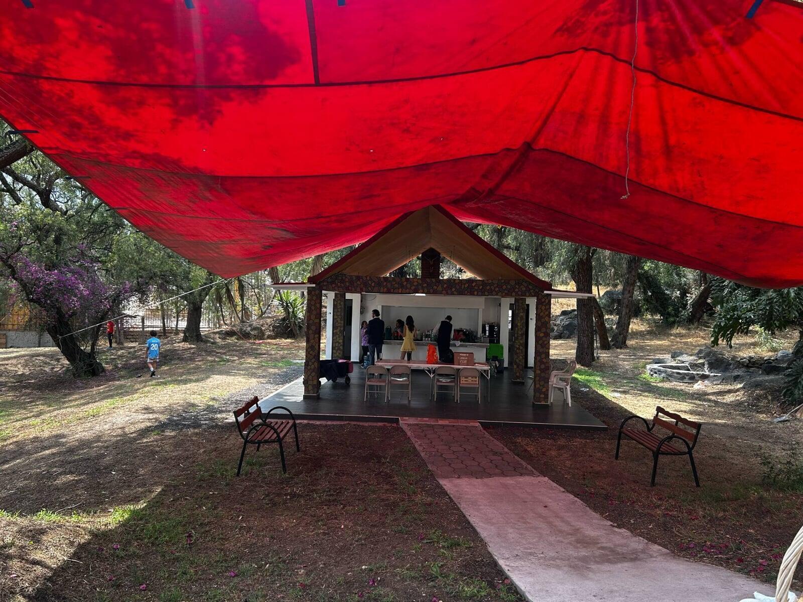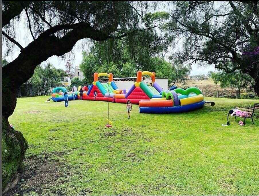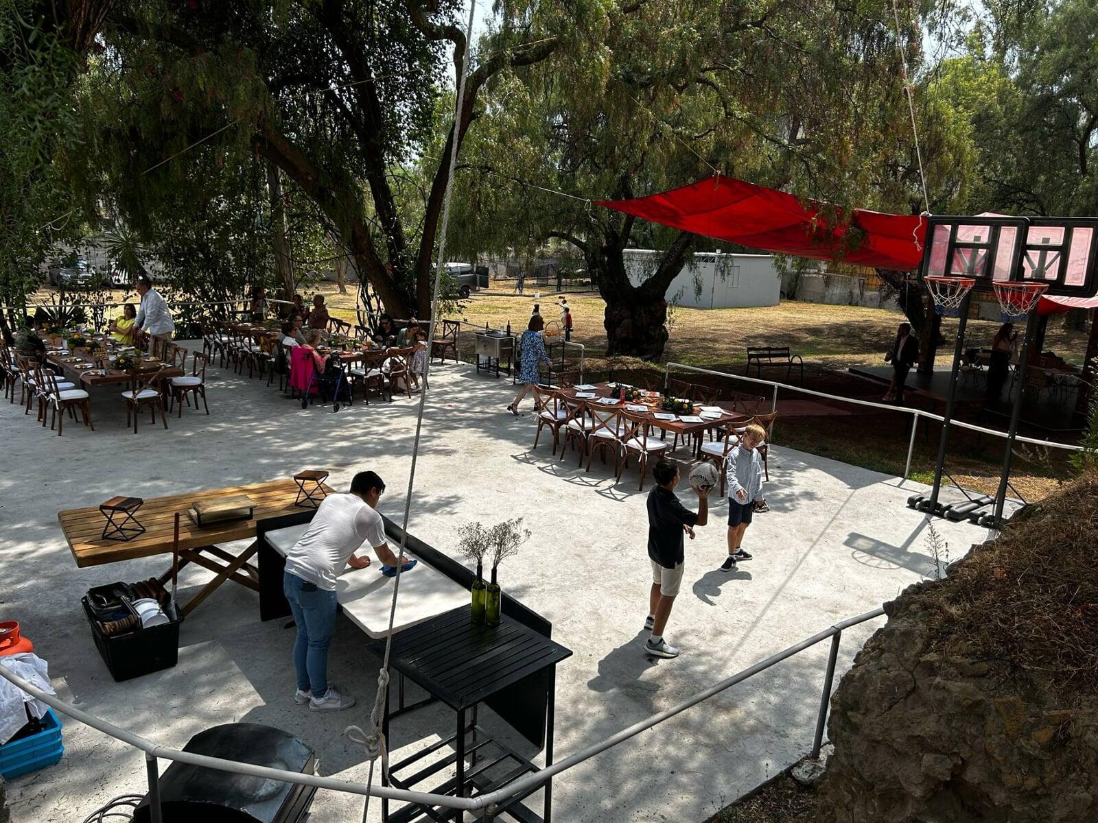 Contamos con un inmenso jardín que se puede ocupar para múltiples cosas, una palapa grande, baños de mujeres, baños de hombres, pista de patinaje, cancha de basquetbol, estacionamiento, columpios y mucho más